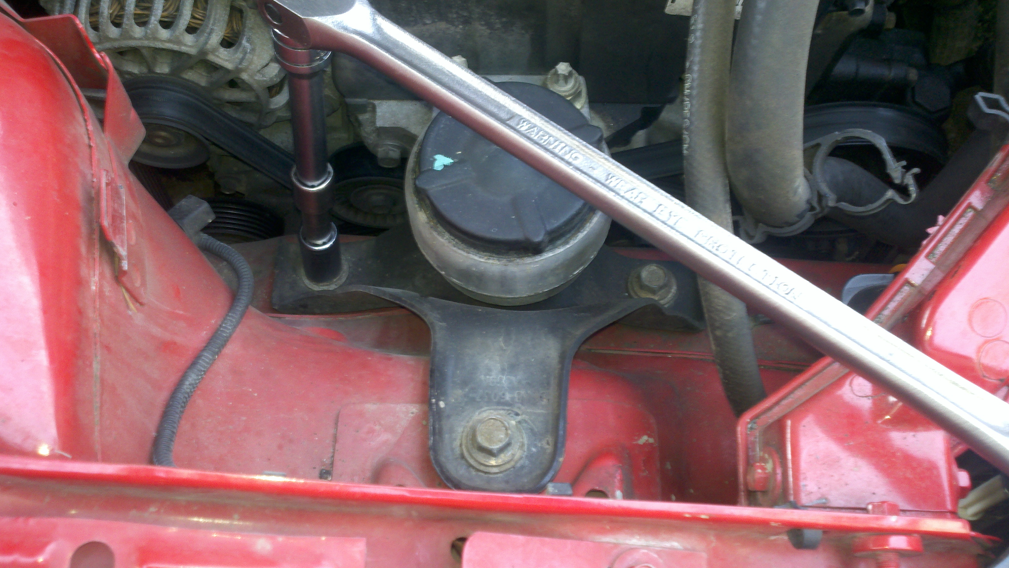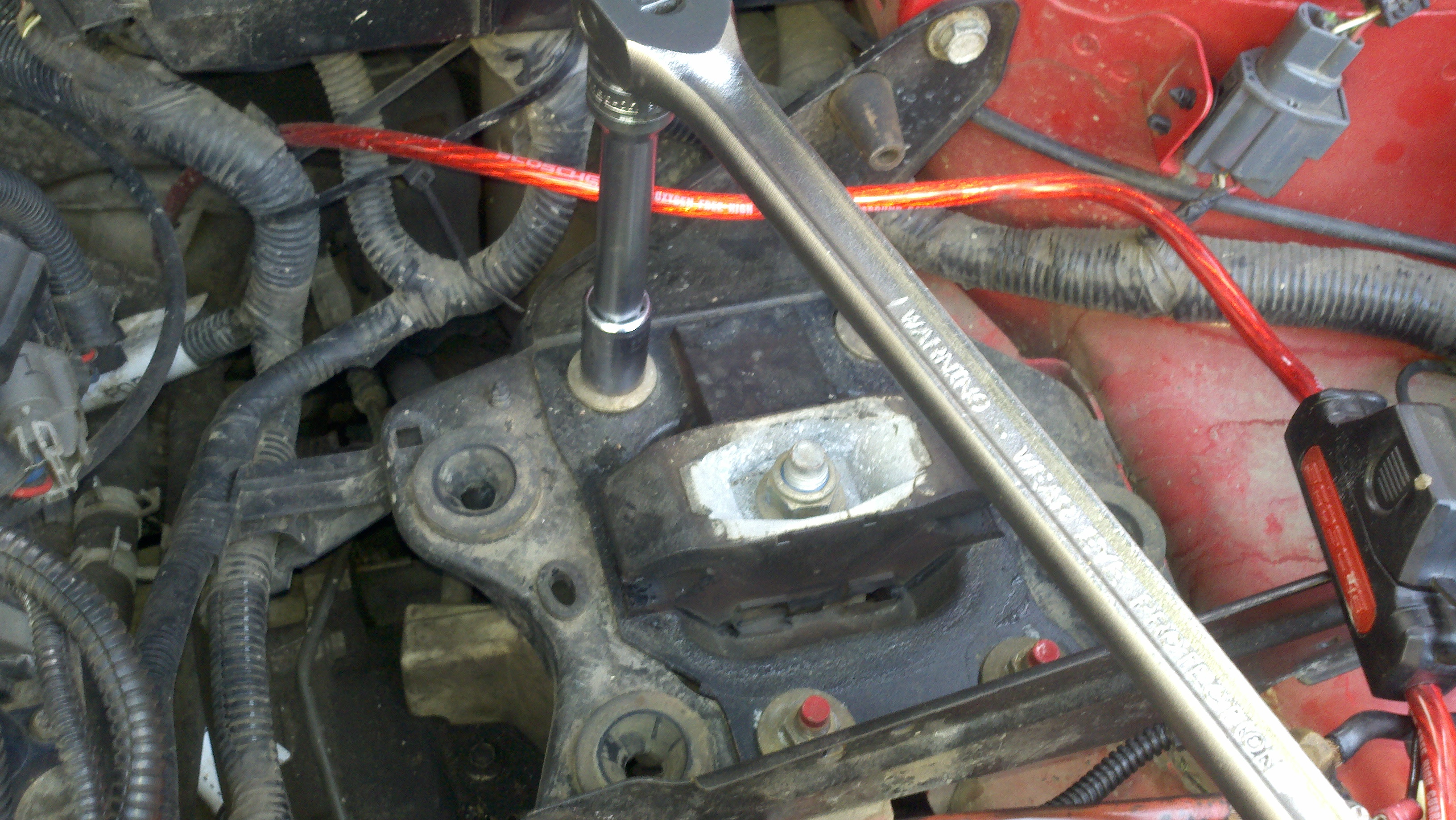 Install the mount and bracket in the car. Tighten down the mount to engine studs and jog the engine to install the bracket to body bolts. Tighten the bolts down then back them off a couple of turns. Lower the engine and move the jack out from the front of the oil pan.