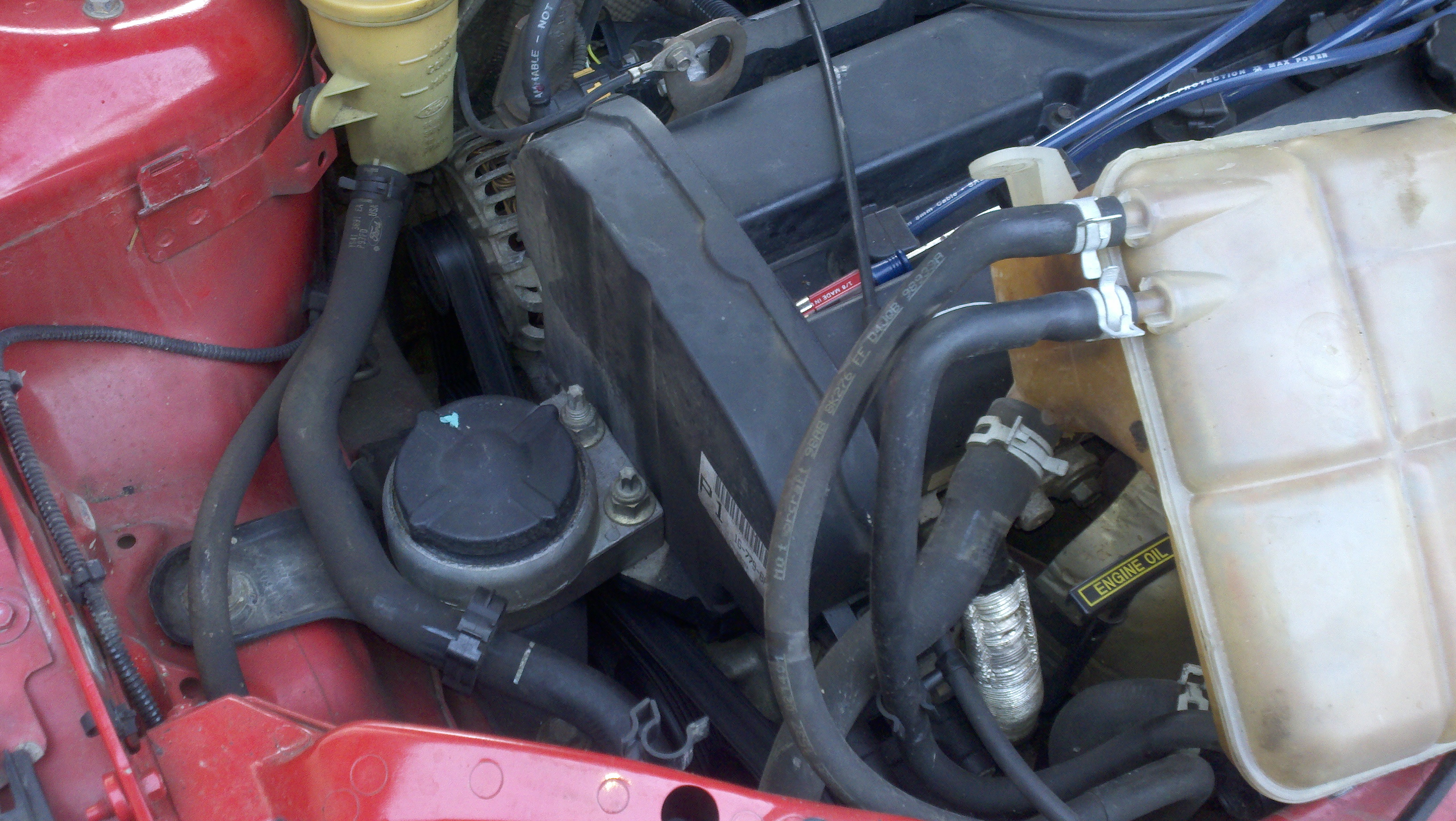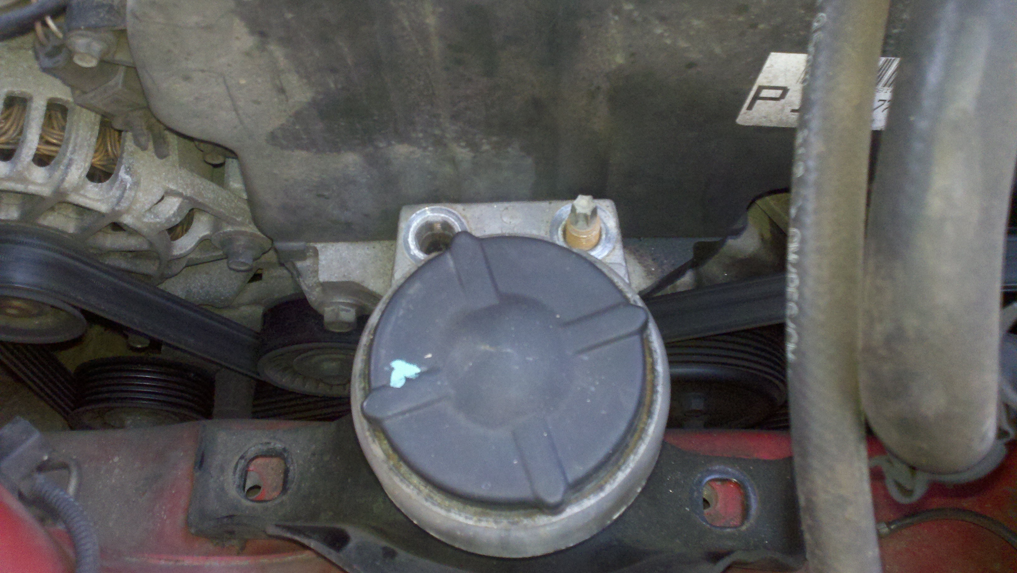 Detach the power steering fluid tank. The tank just lifts straight up.