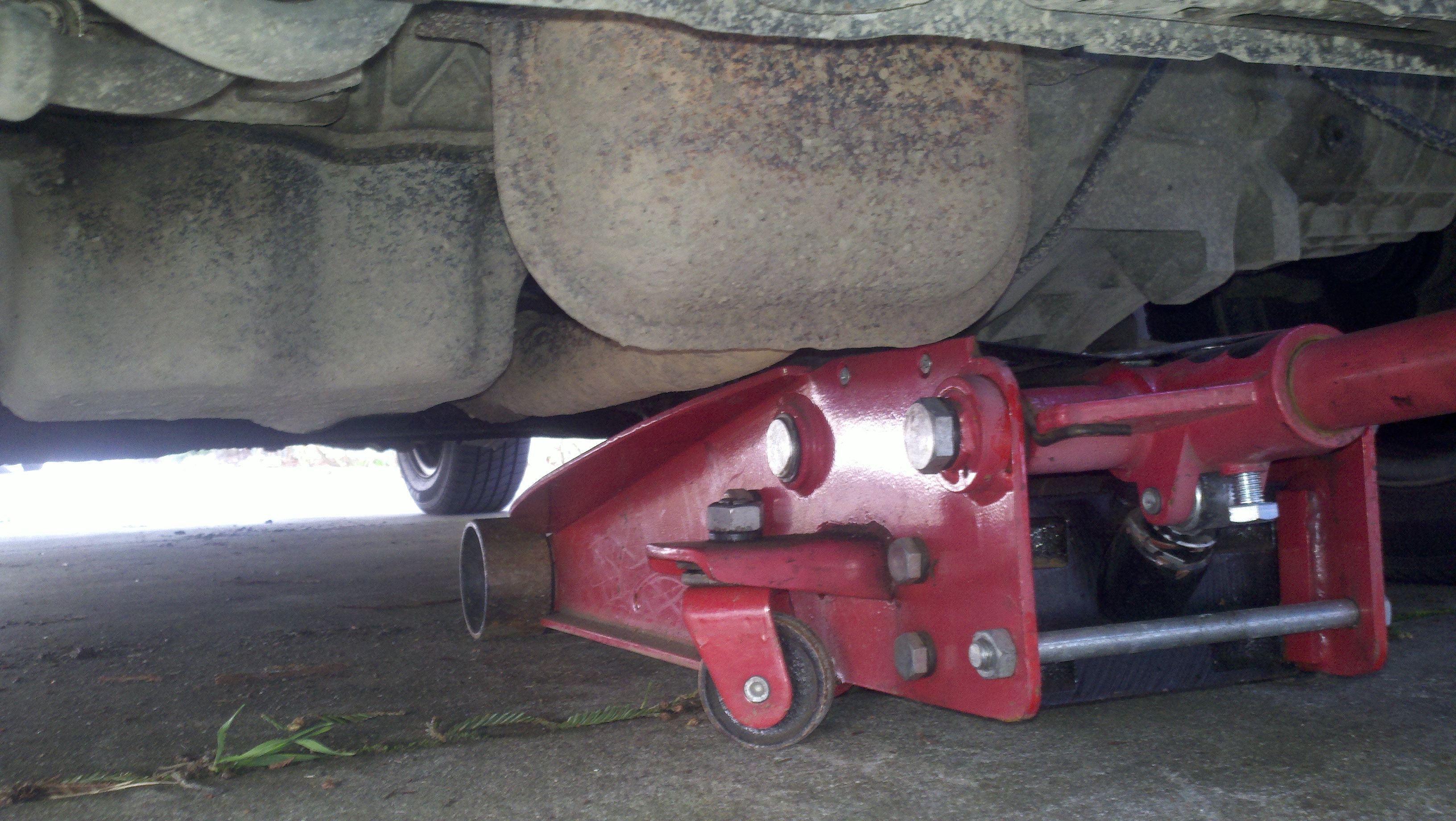 Position the floor jack under the oil pan with a block of wood to protect the pan and