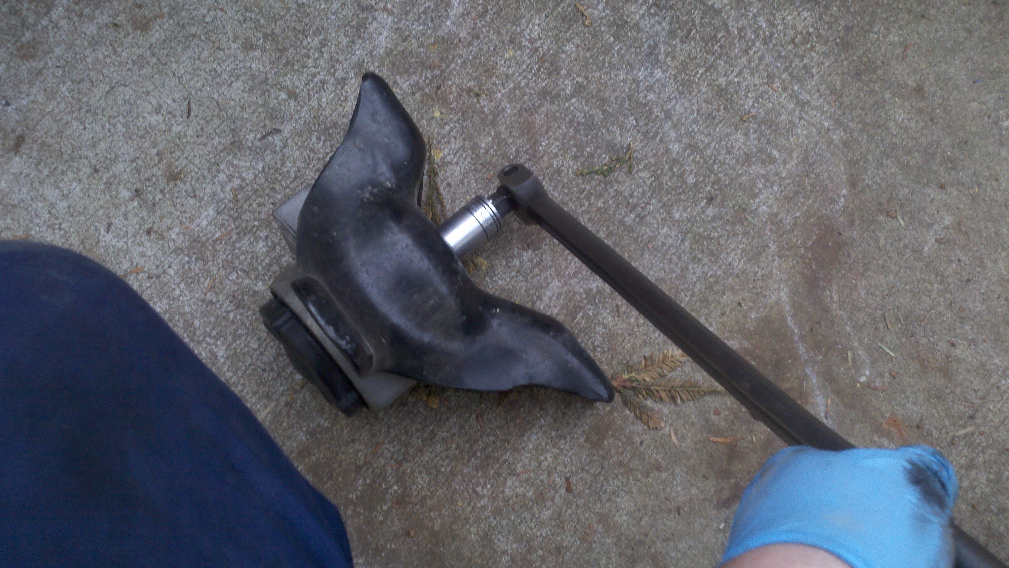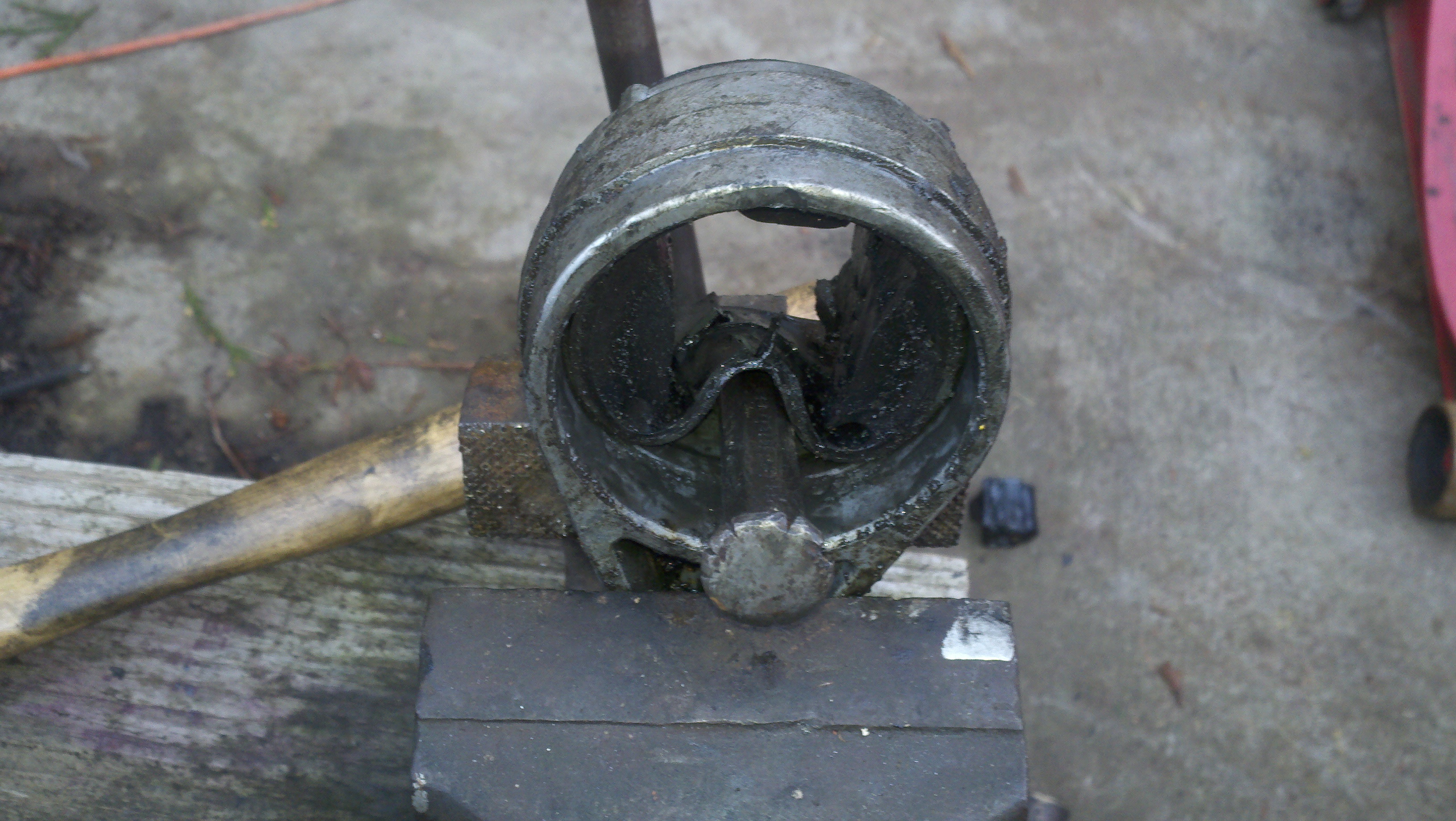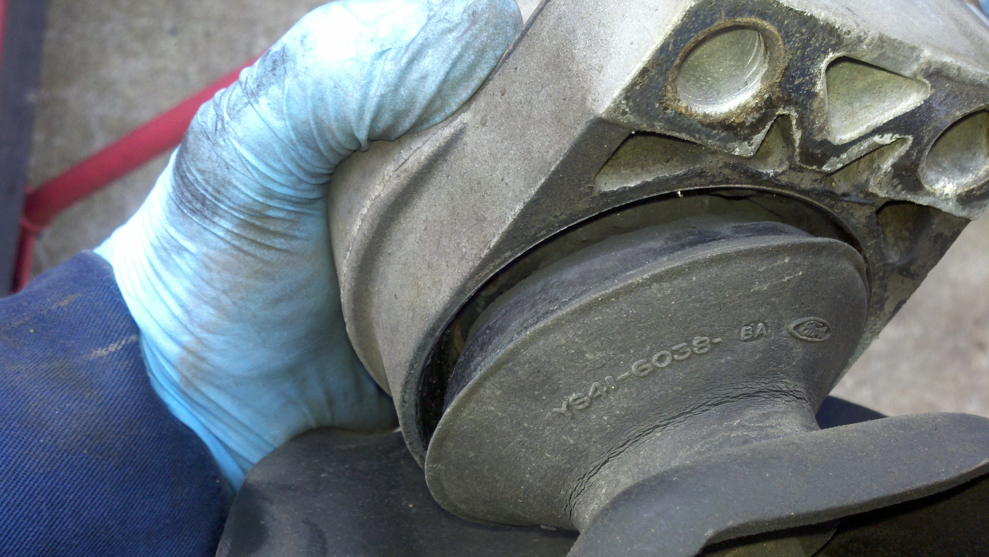 Start with the dogbone mount and knock the broken rubber mounts out of it. I used a small ball peen hammer positioned on the small end rubber bushing and struck it with a sledge and the bushing popped right out. On the large side just work a chisel in between the side of the rubber bushing and the housing and the bushing will push right out. Once the mount is cleaned up you can purchase a set of polyurethane bushings for it. I bought mine from Amazon. The bushings simply push right into the mount by hand, do not use grease or any lubricant.